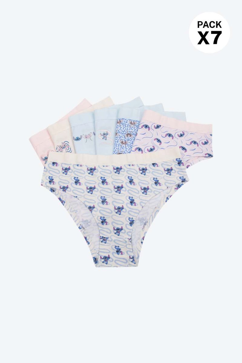 Colección original de Disney. Panties tipo hipster paquetería X7 confeccionados en un material que aporta comodidad y resistencia. Su silueta ofrece una cobertura media en las piernas, brindando comodidad y libertad de movimiento. Cuentan con un elástico delicado que se adapta suavemente a la cintura y un refuerzo en algodón para mayor frescura e higiene en la zona íntima. Una prenda ideal para el día a día. Con delicados estampados y detalles inspirados en Stitch.