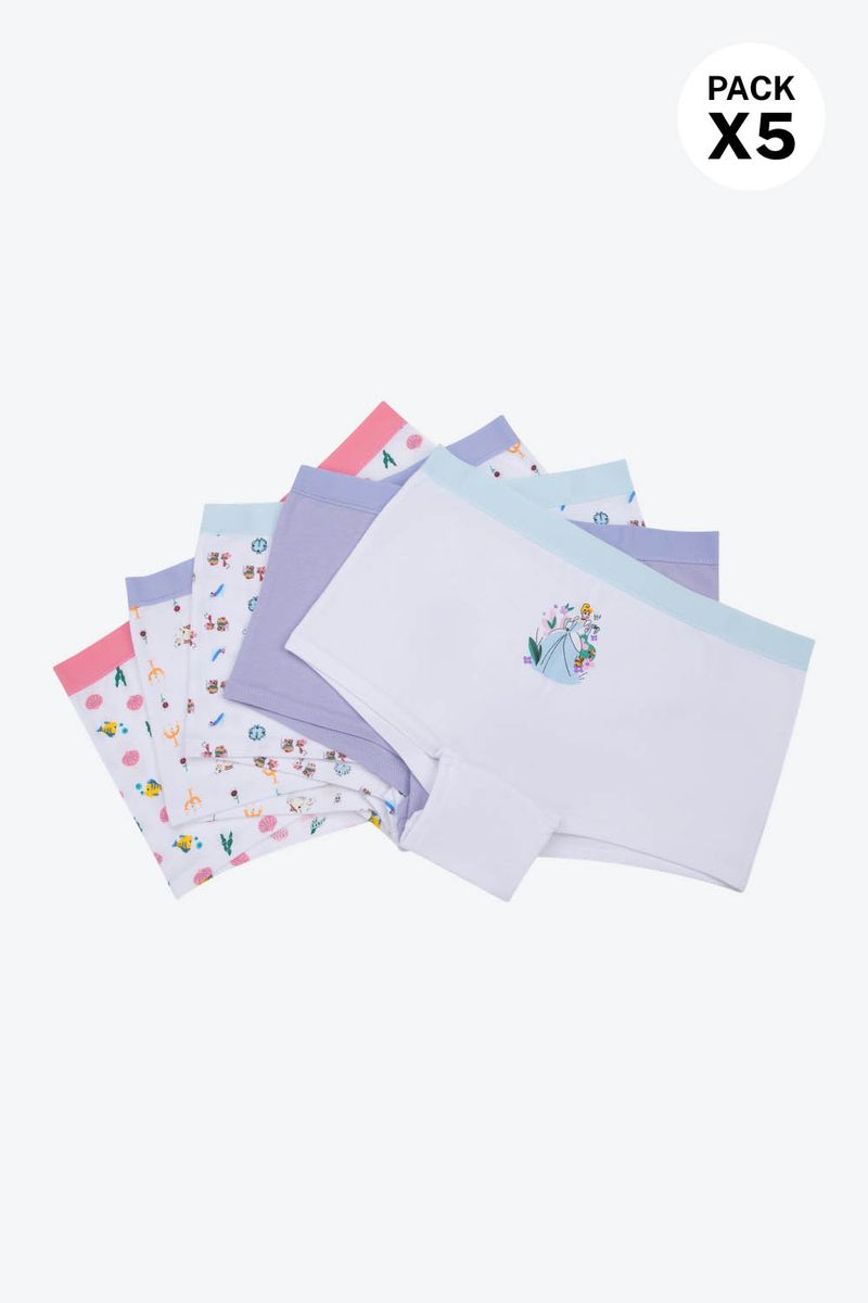 Colección original de Disney. Panties paqueteria X5 tipo bóxer ofrece una excelente cobertura en las piernas, brindando comodidad y libertad de movimiento. Confeccionados en un material muy comodo y resistente, cuentan con un elástico delicado que se adapta suavemente a la cintura y un refuerzo en algodón para mayor frescura e higiene en la zona íntima. Con delicados estampados y detalles inspirados en las princesas Ariel, Bella y Cenicienta.