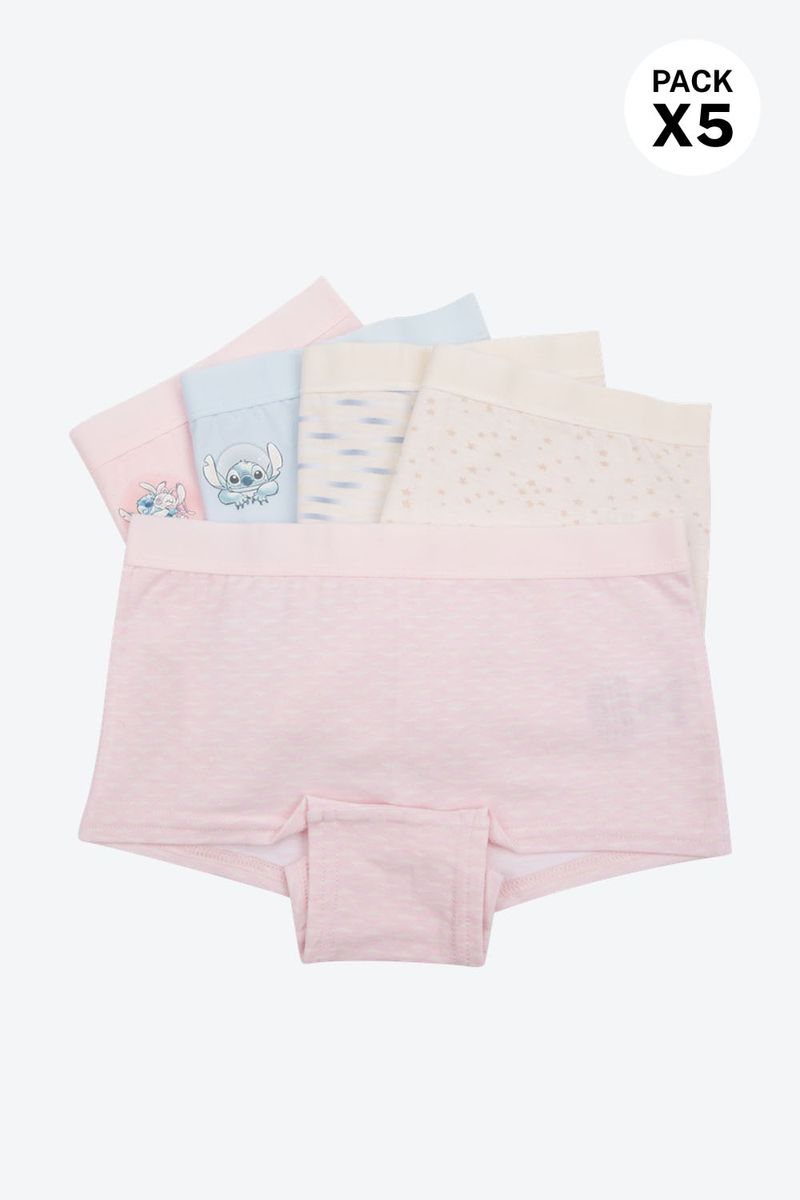 Colección original de Disney. Panties tipo bóxer del segmento Kids Girl paqueteria x5, confeccionados en un material que aporta comodidad y resistencia. Su silueta ofrece una excelente cobertura en las piernas, brindando comodidad y libertad de movimiento, cuentan con un elástico delicado que se adapta suavemente a la cintura y un refuerzo en algodón para mayor frescura e higiene en la zona íntima. Con delicados estampados y detalles inspirados en Stitch.