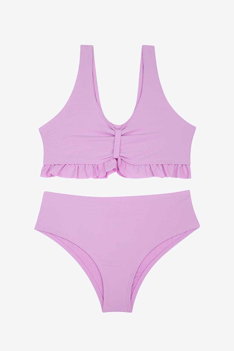 Bikini del segmento Kids Girl elaborado en microfibra, un material suave y cómodo, ideal para disfrutar del agua con total confianza. La parte superior cuenta con un top con cuello redondo, tirantes amplios que brindan mayor comodidad y boleros en la parte inferior que añade un detalle delicado y divertido. Incluye un panty tipo hipster que ofrece excelente cobertura en las piernas y talle alto. Un conjunto diseñado para que las niñas se sientan cómodas, seguras y llenas de estilo durante sus días de diversión.
