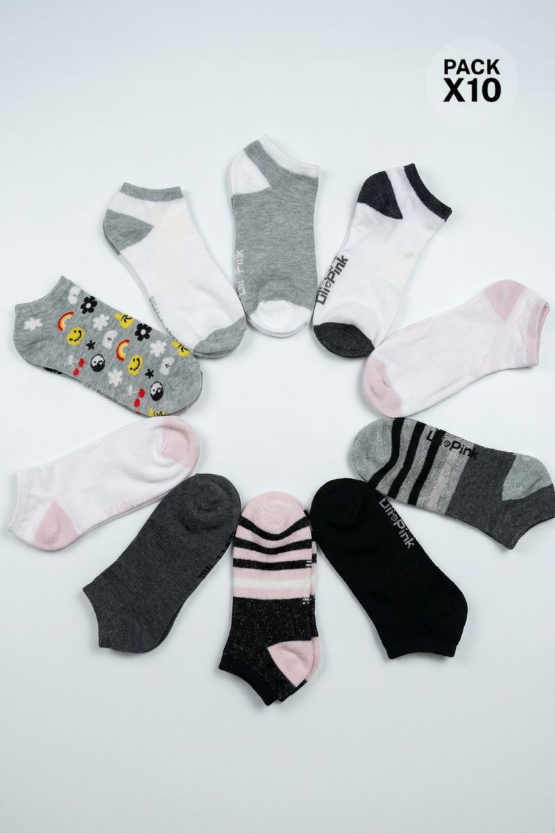 Pack de 10 medias tipo talonera para mujer perfectas para combinar con distintos tipos de calzado. Confeccionadas en poliester, un material que aporta resistencia y comodidad, ofrecen un ajuste ligero y transpirable. Su diseño versátil y suave garantiza una sensación agradable durante todo el día, ideal para el uso diario.