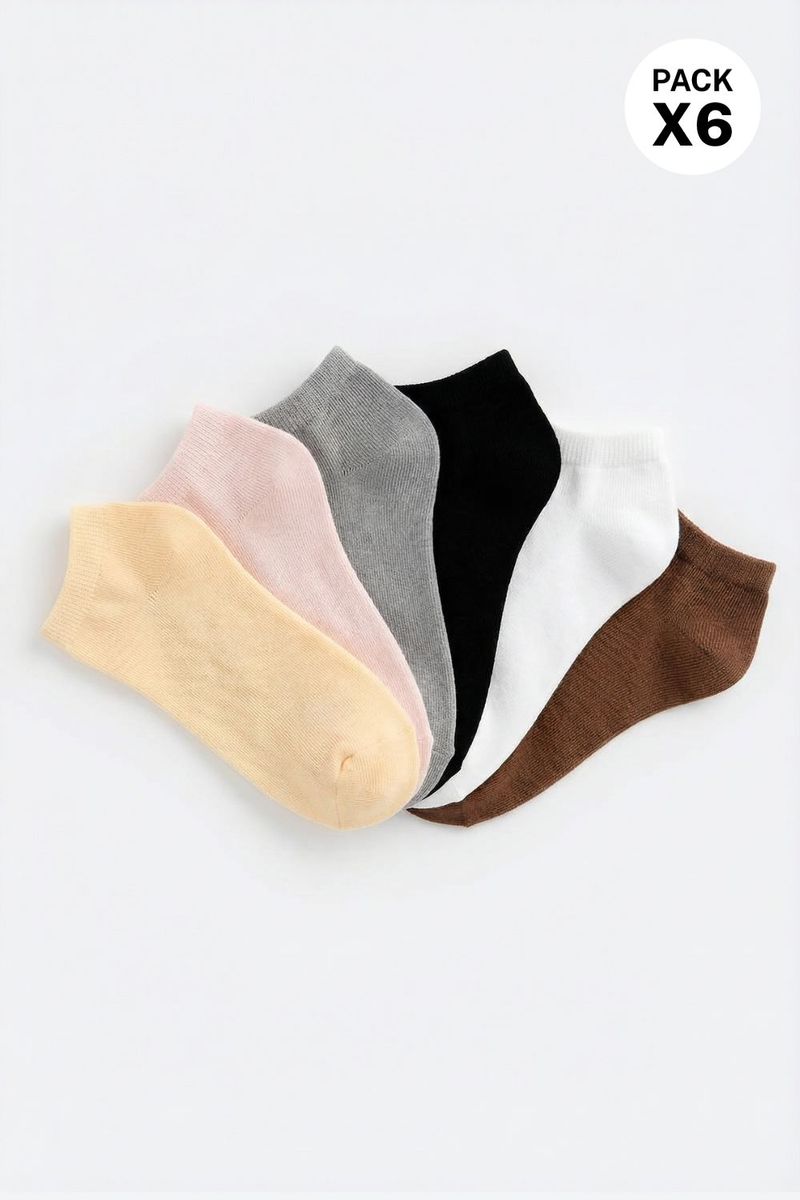 Pack de 6 medias tipo tobillera para mujer perfectas para combinar con distintos tipos de calzado. Confeccionadas en poliéster, un material resistente y cómodo, brindan un ajuste ligero y transpirable. Ideales para el uso diario, garantizando confort y durabilidad en cada paso.