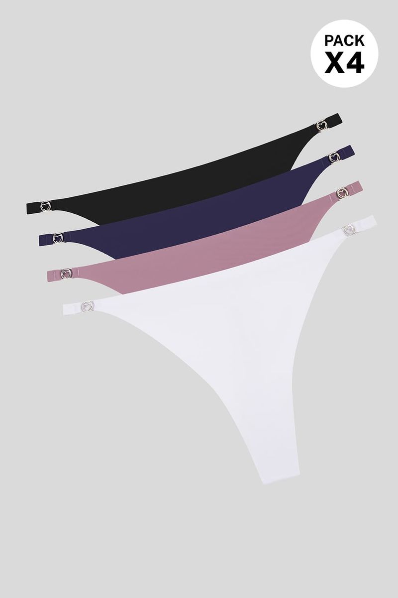 Panty tipo brasilera en paquete X4, perfecto para añadir sensualidad a tu día a día gracias a su cobertura leve en piernas y glúteos. Elaborado en microfibra, un material suave y cómodo, incorpora tecnología de termofusionado en la cintura y corte láser en las piernas, asegurando un ajuste perfecto sin marcas ni enrollamientos bajo la ropa. Su diseño incluye tirantes en los costados que se unen a un accesorio en la parte posterior, y delicados accesorios en forma de corazón en los laterales, que aportan un toque innovador y femenino. Además, su refuerzo en algodón garantiza frescura e higiene en la zona íntima.