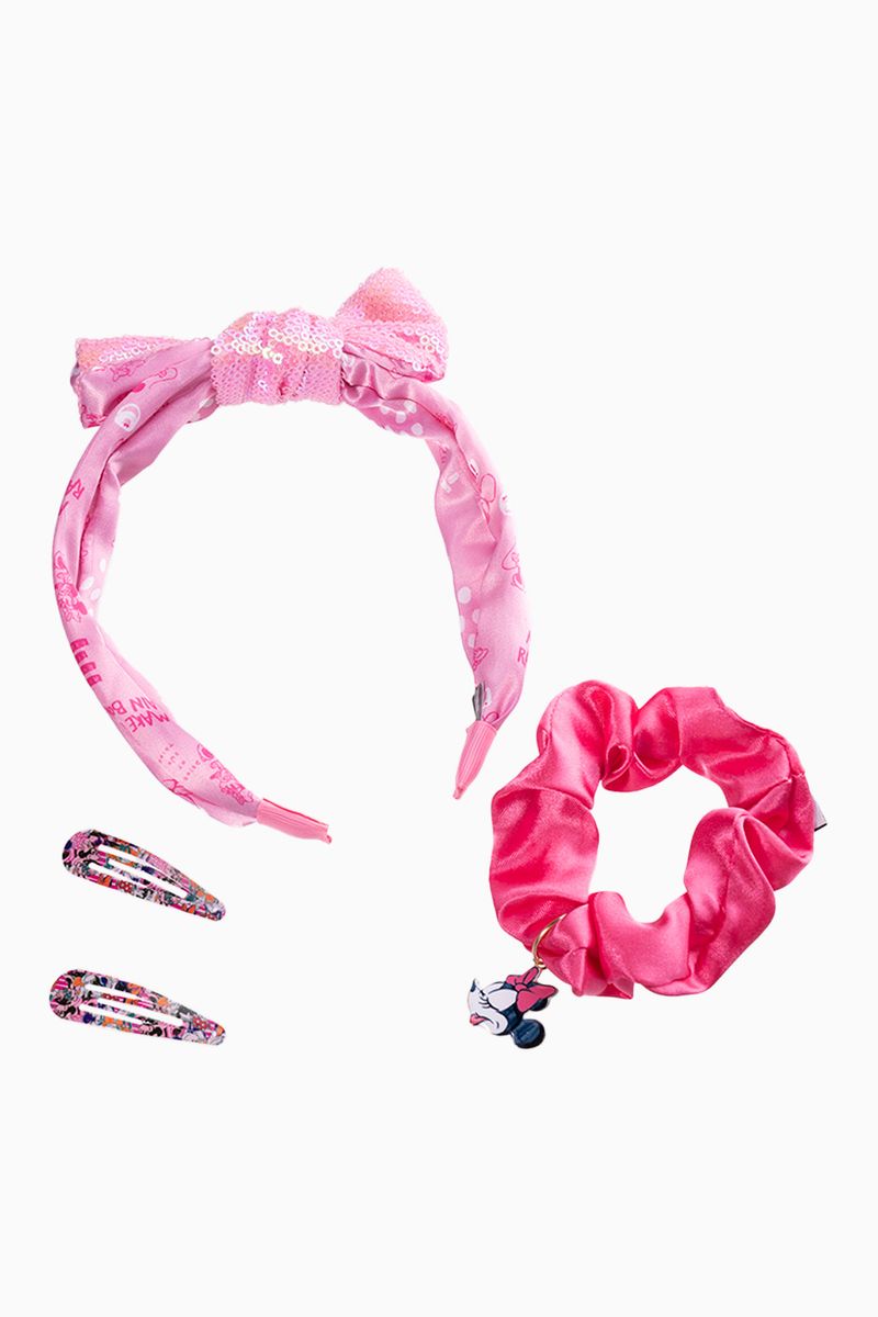Dale un toque de diversión y magia a tu peinado con este set de accesorios inspirado en Minnie Mouse. El set incluye una diadema con lazo y lentejuelas, un scrunchie satinado con un dije de Minnie, y dos hebillas decoradas con glitter, todo en tonos vibrantes y detalles brillantes, perfectos para resaltar cualquier look.